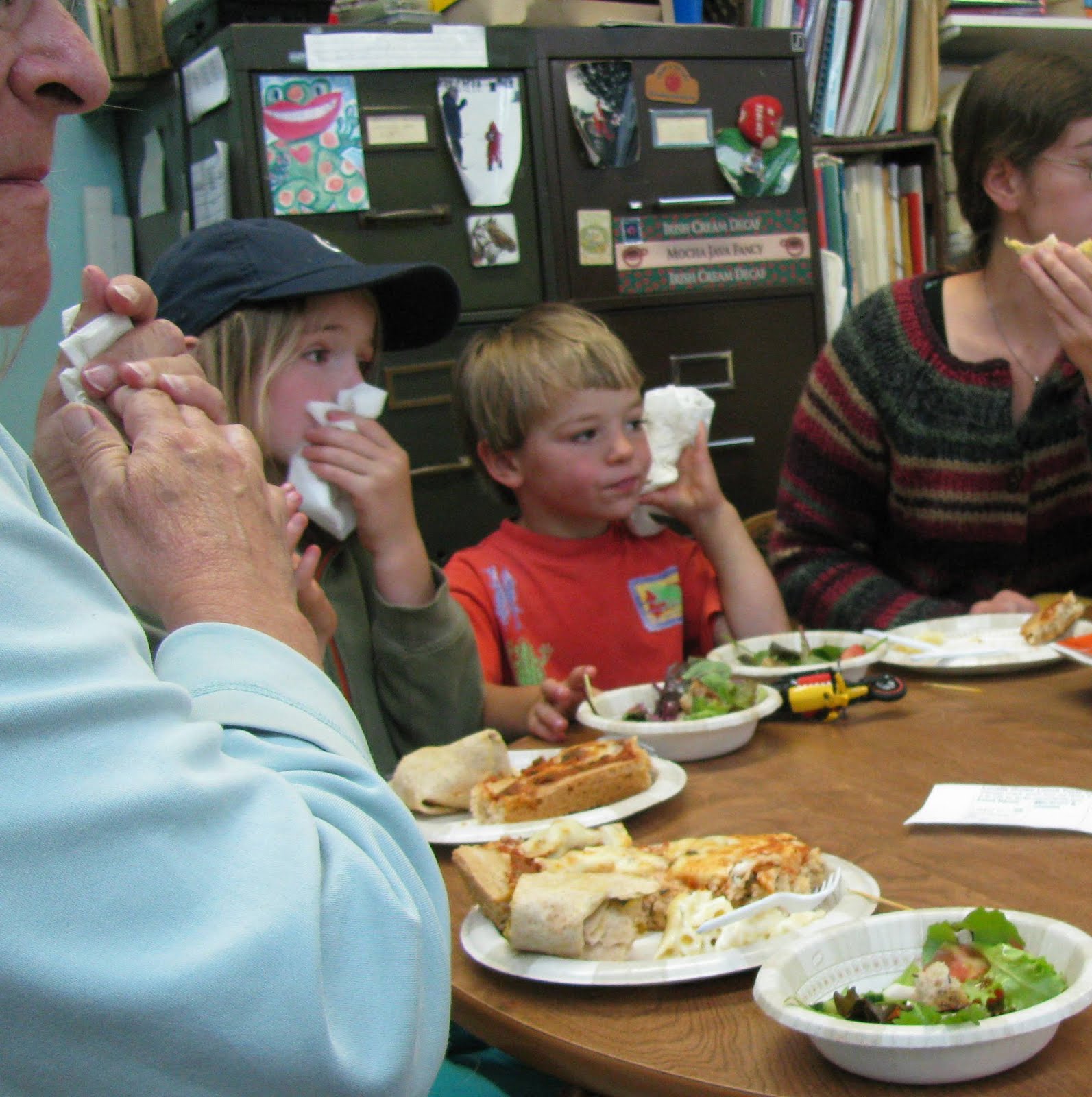 So, on Friday afternoon I arrived to the Craftsbury Elementary School and helped hand out the surveys I had copied and cut on Thursday afternoon for the kids to rate how they liked the food. (I'm the redhead in yellow on the right :) )